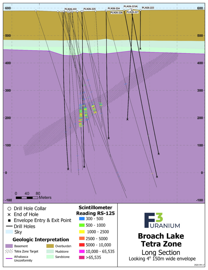 The six-hole step-out program tested extensions of the Tetra Zone along strike and down plunge. Uranium mineralization was successfully intersected in three holes. Highlighting the program, hole PLN26-226 returned 0.5 m of radioactivity up to 1,400 cps (from 470.5 to 471.0 m) 275m along strike from the high grade intersected in PLN25-219A which returned a main mineralized interval of 13.0m of 0.28% U3O8, including three high grade sections with 3.0 m of 1.19% U3O8 from 396.5 to 399.5m (see NR March 31, 2026). Additional intervals of anomalous radioactivity were intersected in holes PLN26-225 and PLN26-222.