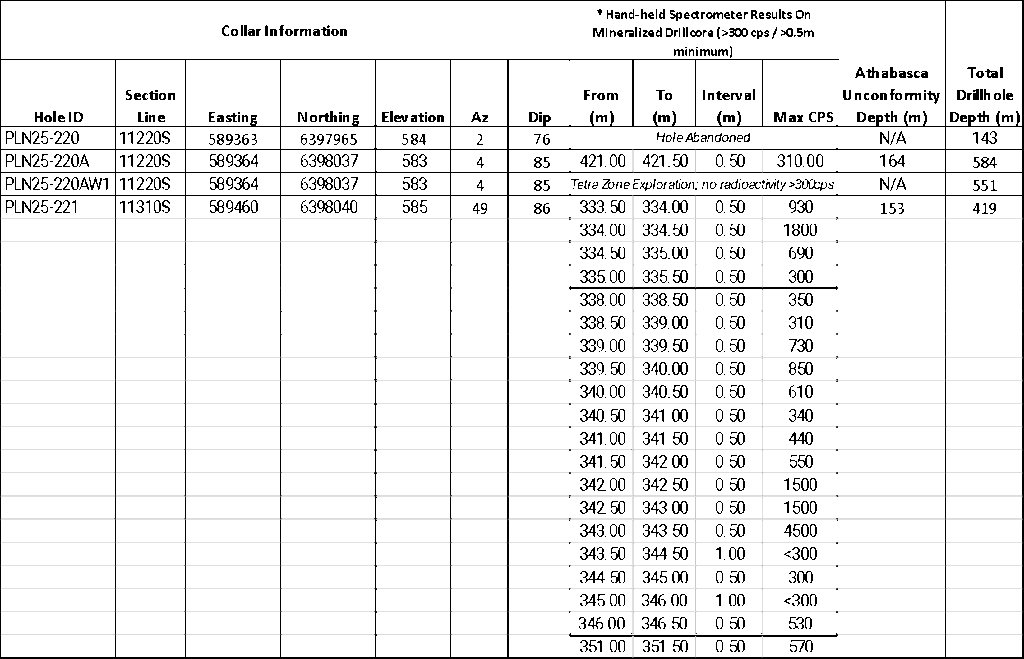 “The fall 2025 program was designed to test the plunge continuity of uranium mineralization in the Tetra Zone shear. Drilling extended the known mineralized plunge length from 60m to 135m. On the down-plunge (western) side, holes PLN25-220A and PLN25-220AW1 tested continuity but appear to have intersected the structure just above the expected mineralized zone, with radioactivity and broader shearing observed in PLN25-220A. On the up-plunge (eastern) side, PLN25-221 confirmed continuity, stepping out approximately 28m from PLN25-205 (see news release, July 16, 2025). The roughly 300m of shear zone remaining in the up-plunge direction toward the Athabasca Unconformity, along with the down-plunge extent, represent first order priority areas for follow-up drilling, which we are planning to start later this month. Assays from the fall program, including PLN25-217, which intersected mineralization over a total of 29.5m, 27.5m of which is continuous and includes 2.30m of >10,000 cps between 396.70m and 407.30m, are currently at SRC and will be released as they become available.”