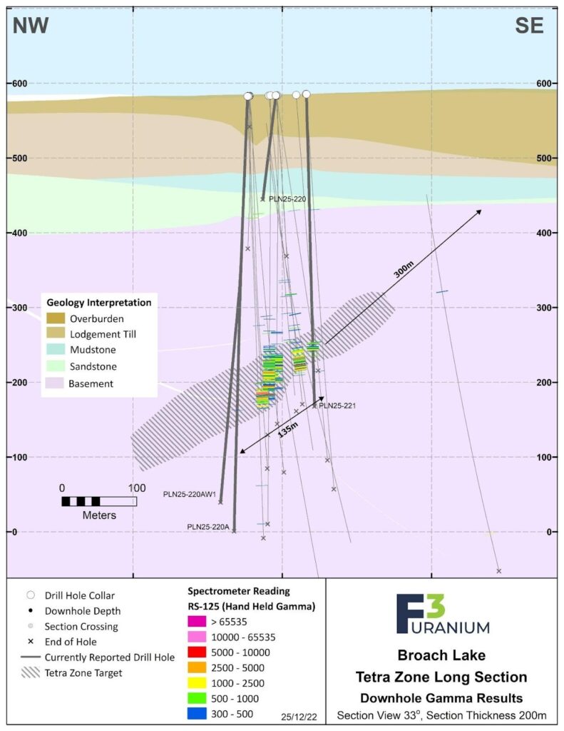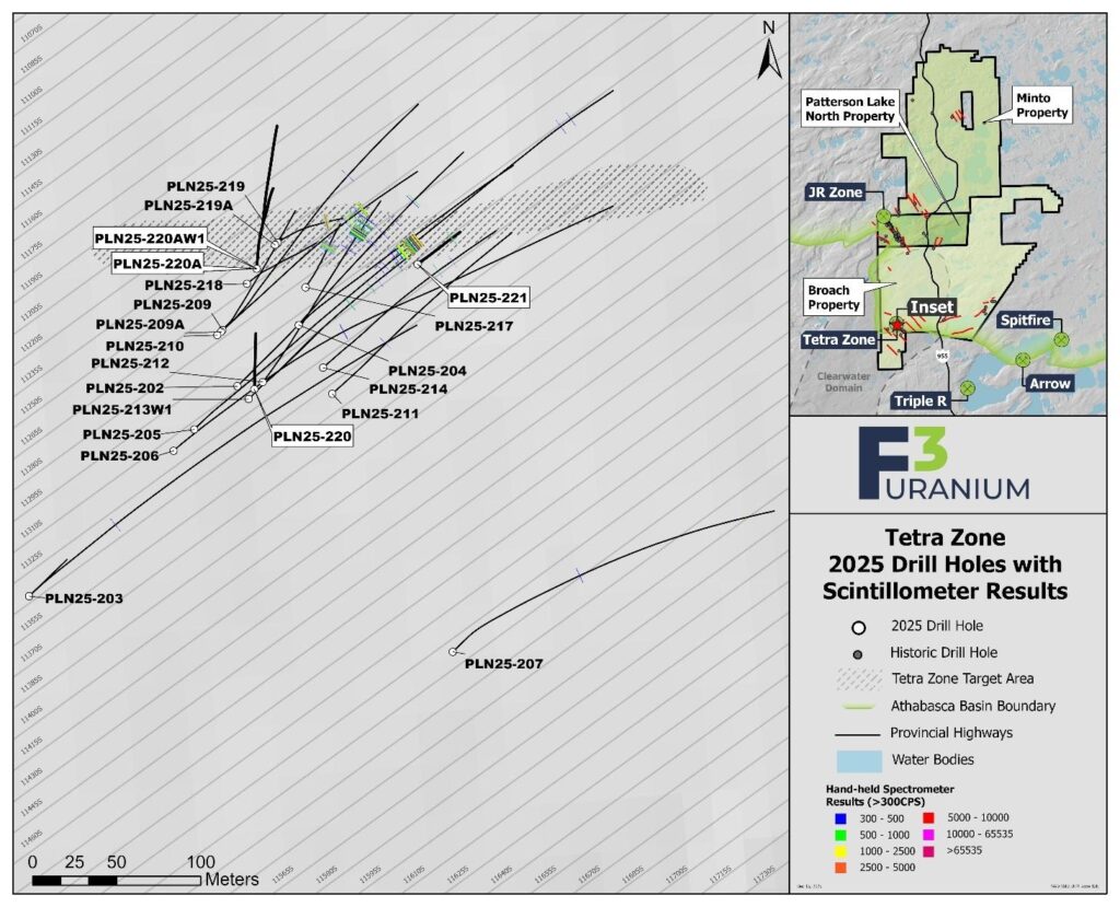 Kelowna, British Columbia— (Newsfile Corp. – January 13, 2025) – F3 Uranium Corp (TSXV: FUU) (OTCQB: FUUFF) (“F3” or “the Company”) is pleased to announce final scintillometer results from its 2025 fall drill program on the Tetra Zone on the Broach Property. The program consisted of five diamond drill holes totaling 2,628m and extended the interpreted mineralized plunge length from 60m to 135m, an increase of 125%.