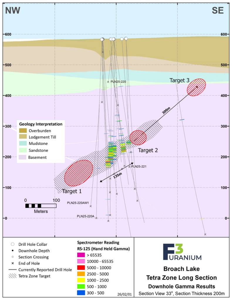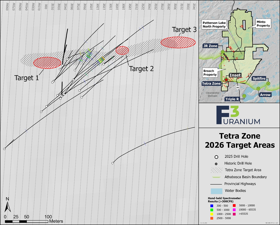 Kelowna, British Columbia— (Newsfile Corp. – February 3, 2026) – F3 Uranium Corp (TSV: FUU) (OTCQB: FUUFF) (“F3” or “the Company”) is pleased to announce the commencement of the winter drill program at its 100% owned Broach Lake Property, on the recently discovered high-grade Tetra Zone (see NR July 7, 2025), located just within the south-western edge of the Athabasca Basin 12km northwest of Paladin’s Triple R and 16km west-northwest of NexGen Energy’s Arrow high-grade uranium deposits.